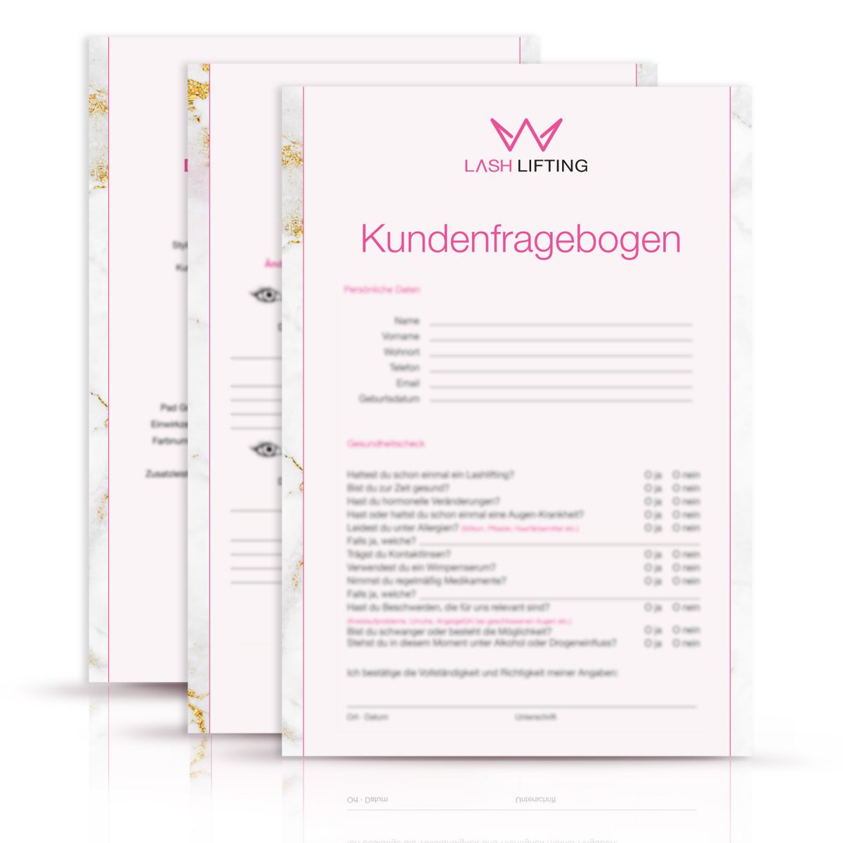 Gerade bei deinen Neu-Kundinnen ist eine individuelle Beratung besonders wichtig. Deshalb darf dieser Fragebogen in deinem Studio nicht fehlen. Auf der Rückseite kannst du eine Punkteder Behandlung deiner Kundin eintragen. Hierbei handelt es sich um einen sehr detaillierten Fragebogen inklusive Einverständniserklärung und Bilder-Rechte-Zustimmung.